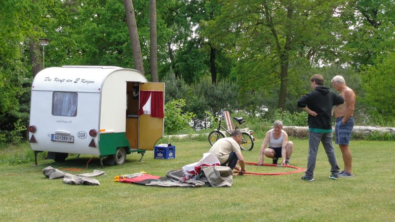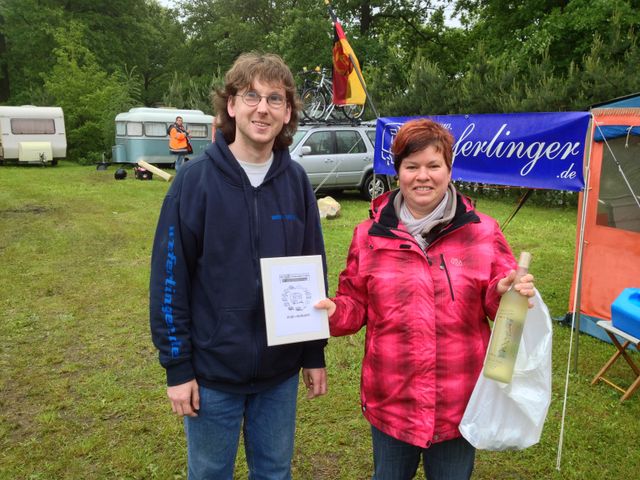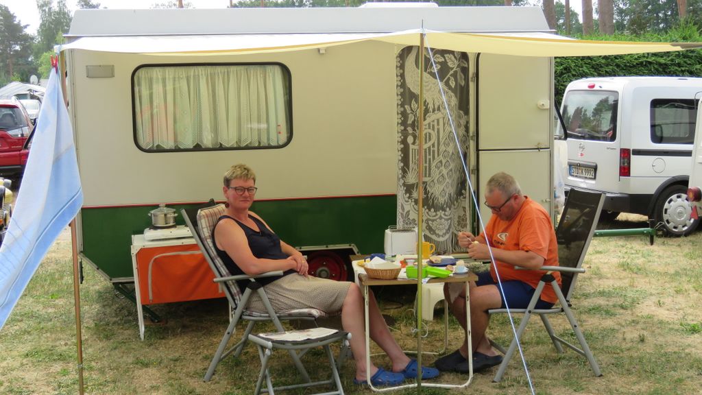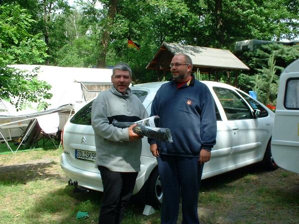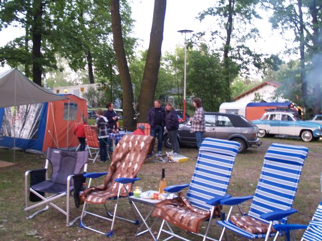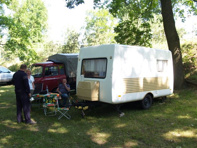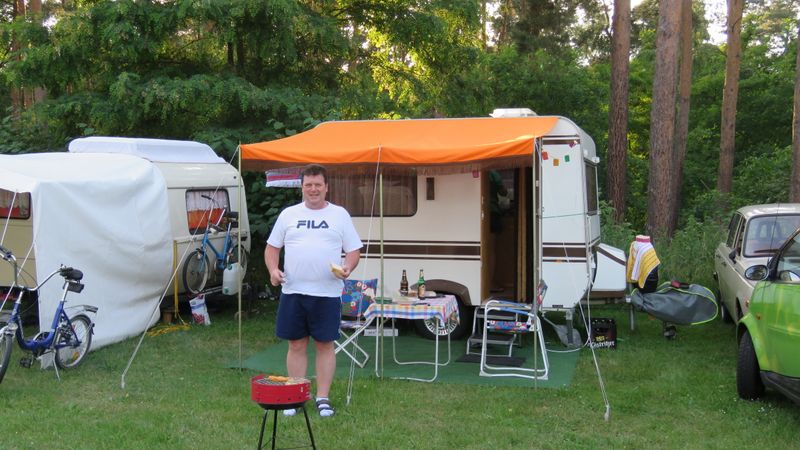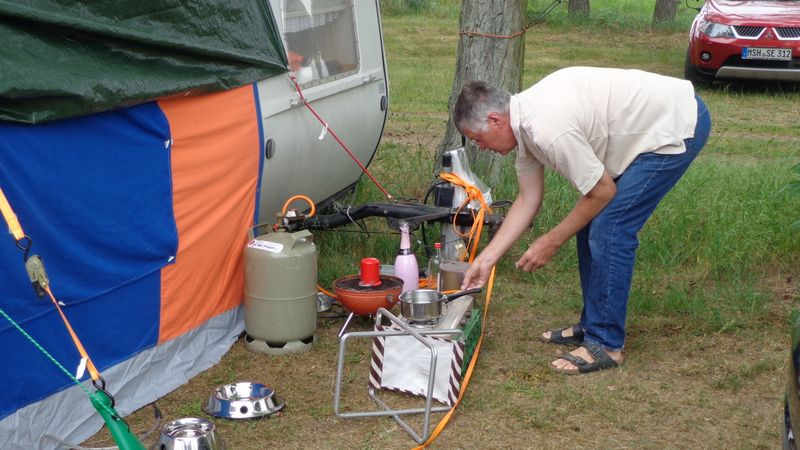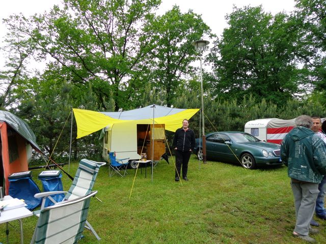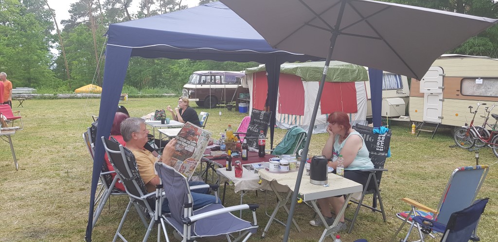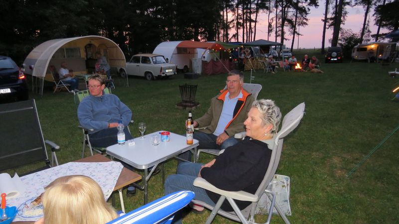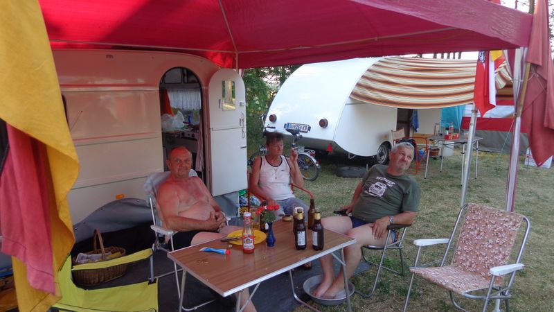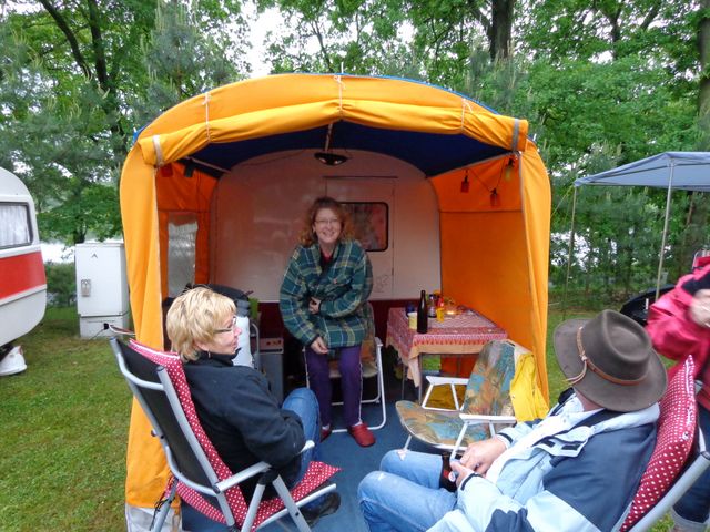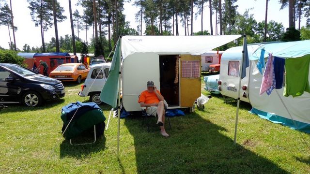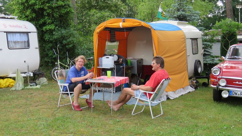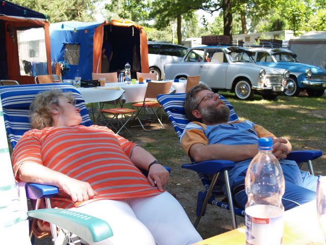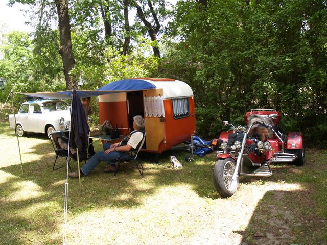 Beim gemeinsamen Frühtück haben wir das originellste Gespann prämiert. So konnte Micha mit dem Trabbi-Kübel und dem passenden Qek einen prima Liegestuhl, gesponsert von www.elbe-caravan.de, in Empfang nehmen