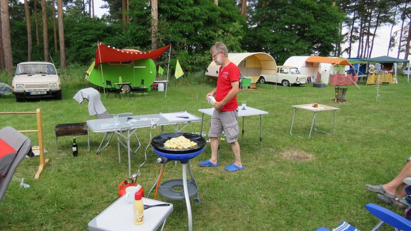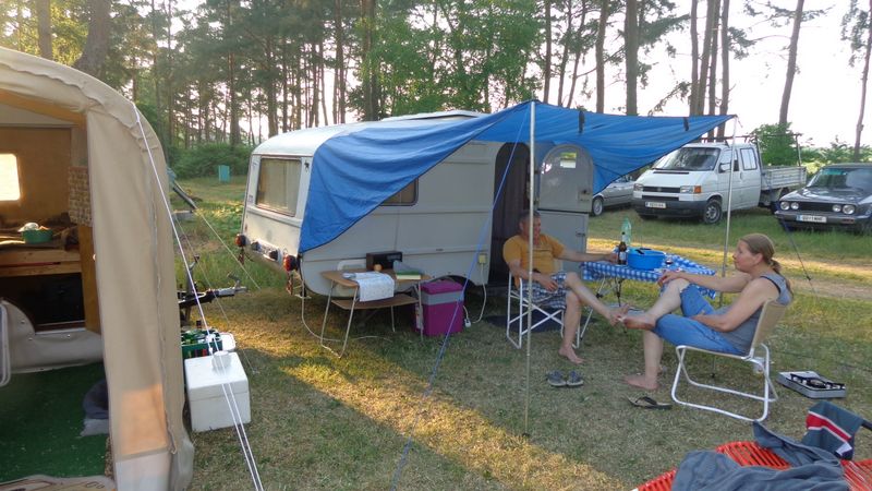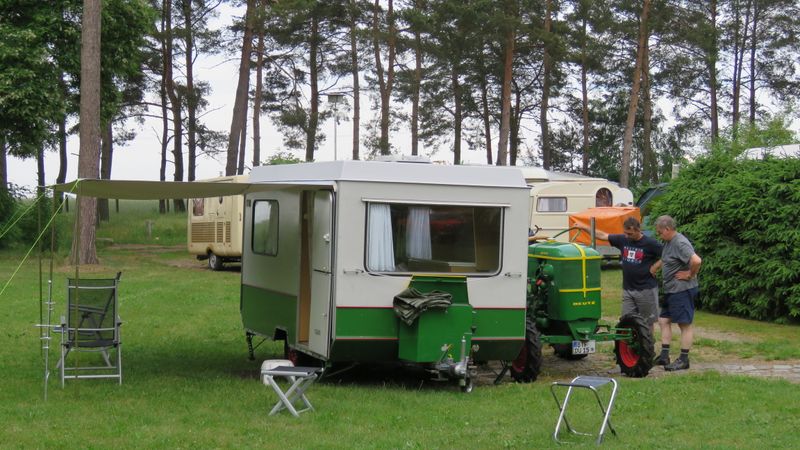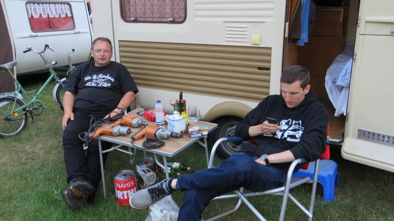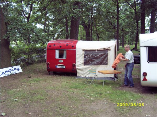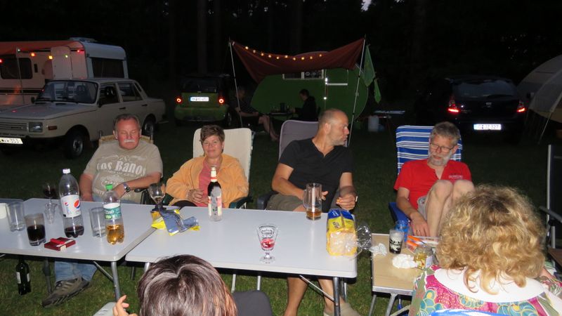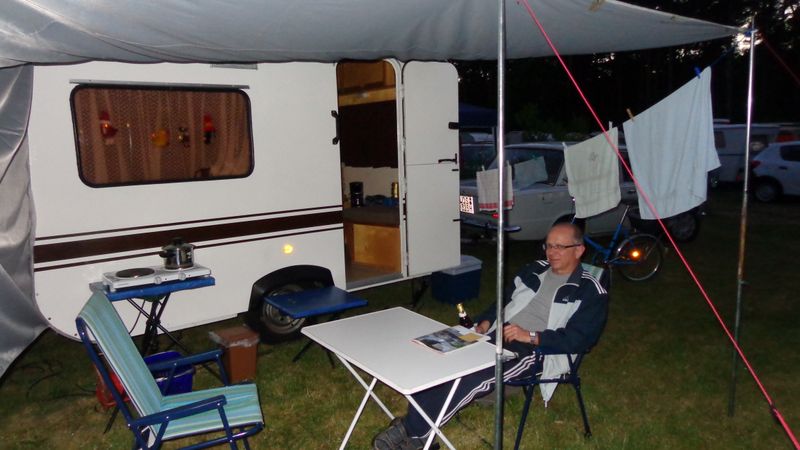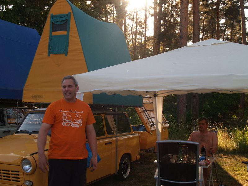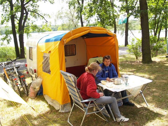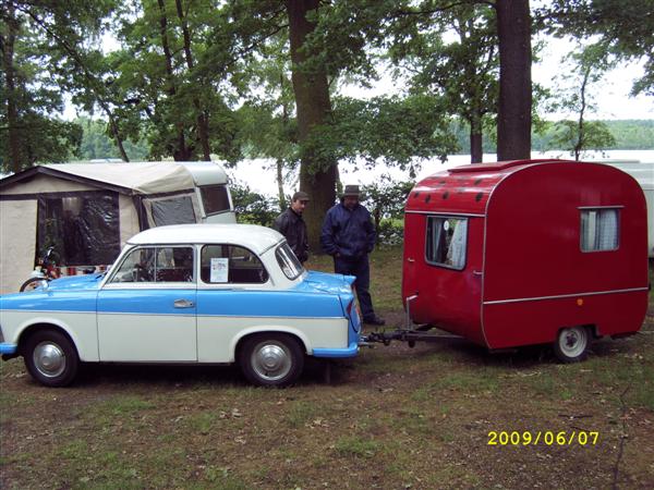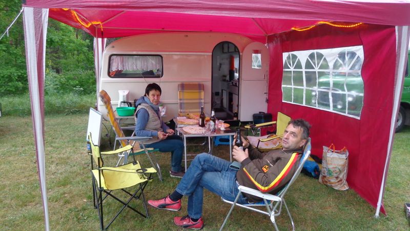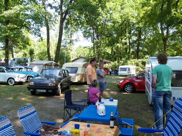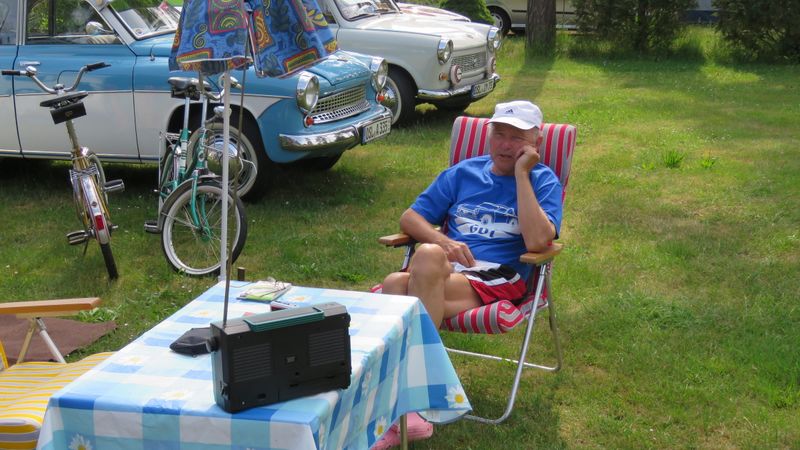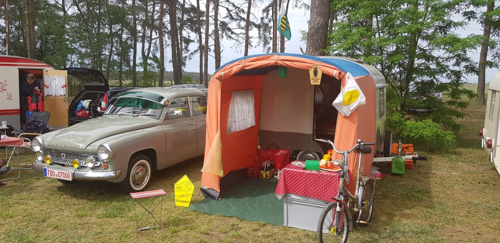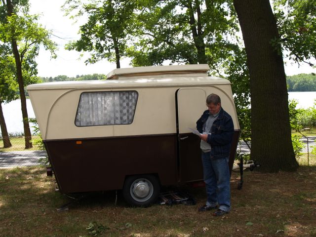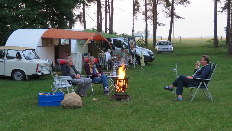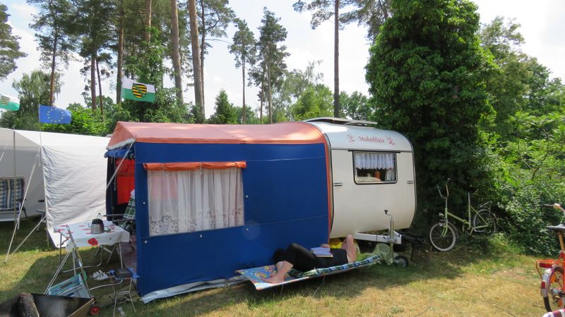 Beim gemeinsamen Frühtück haben wir das originellste Gespann prämiert. So konnte Micha mit dem Trabbi-Kübel und dem passenden Qek einen prima Liegestuhl, gesponsert von www.elbe-caravan.de, in Empfang nehmen