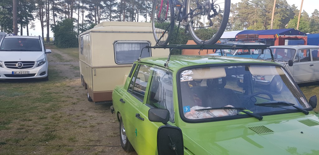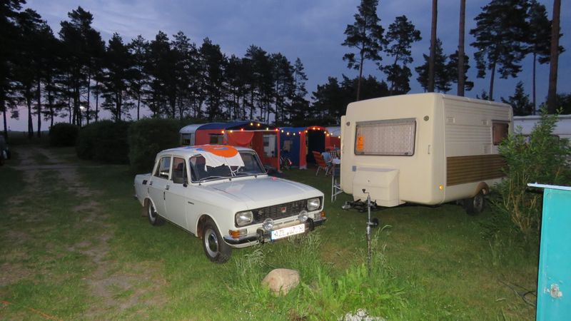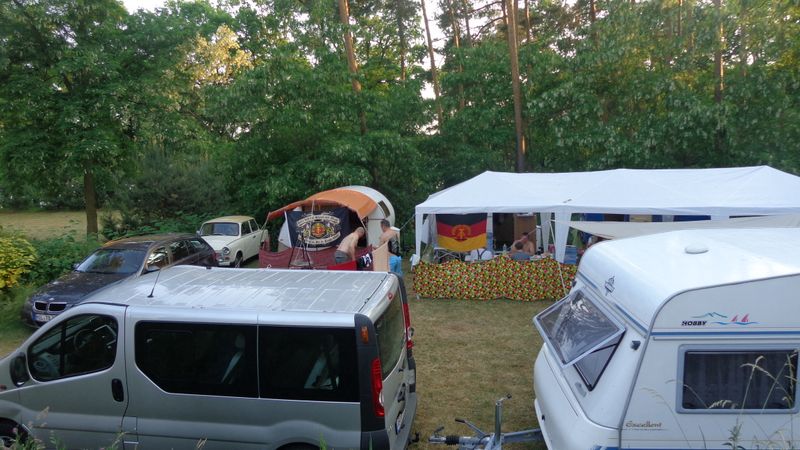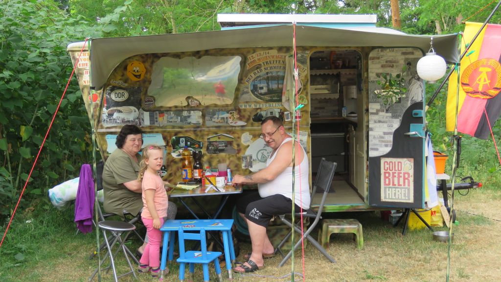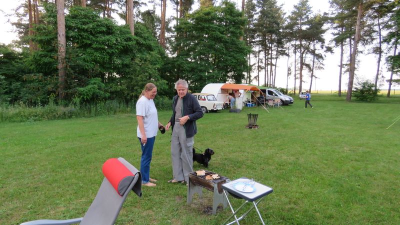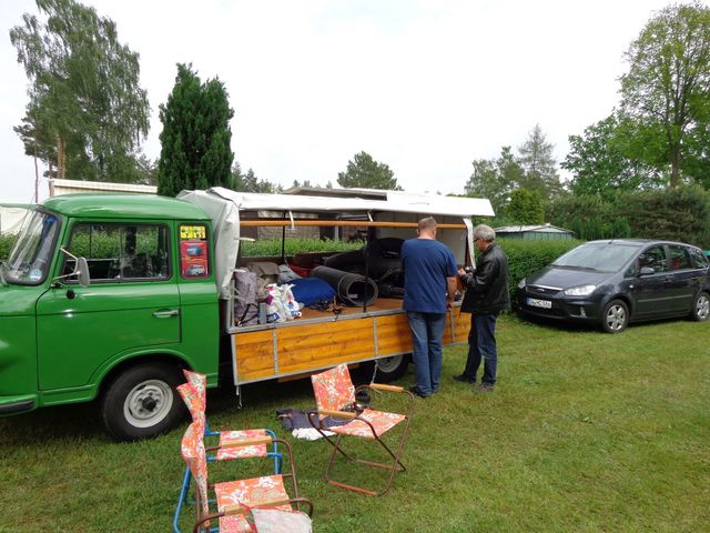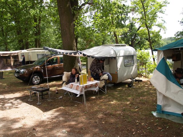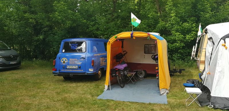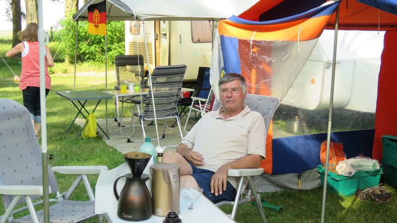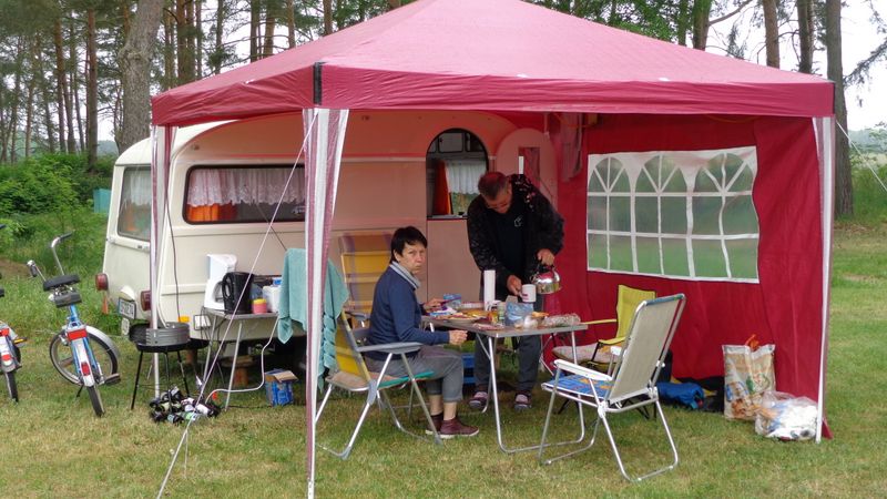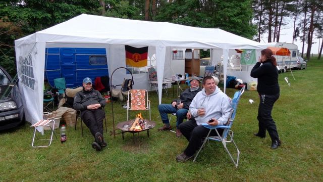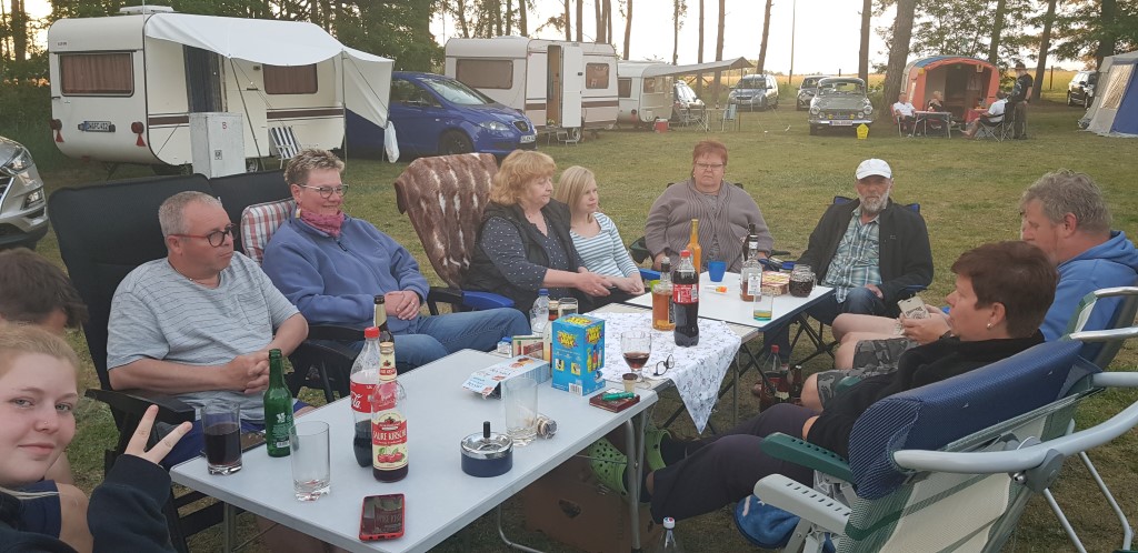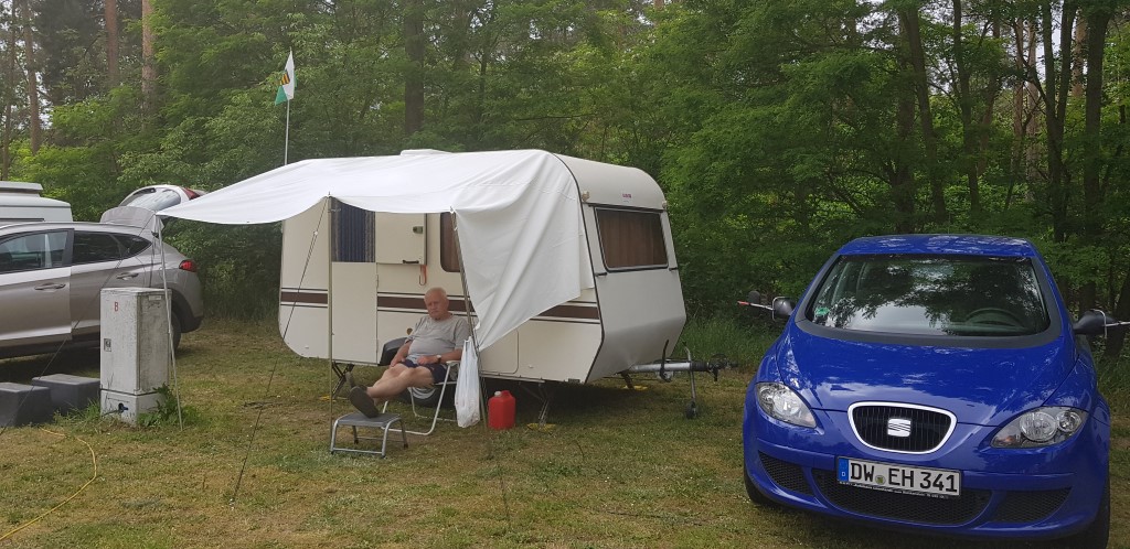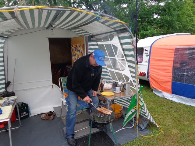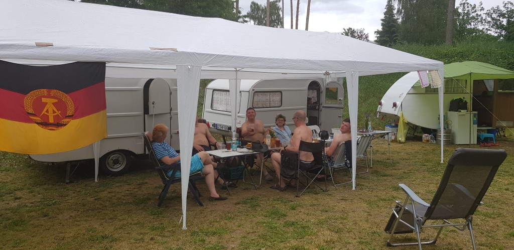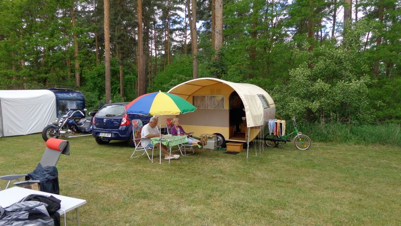 Beim gemeinsamen Frühtück haben wir das originellste Gespann prämiert. So konnte Micha mit dem Trabbi-Kübel und dem passenden Qek einen prima Liegestuhl, gesponsert von www.elbe-caravan.de, in Empfang nehmen