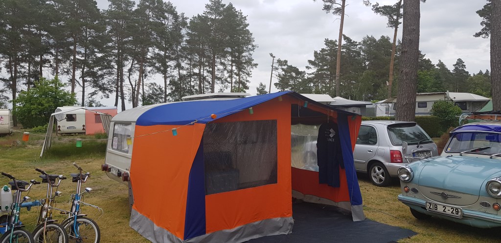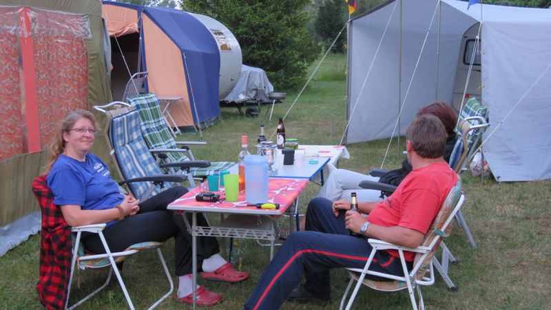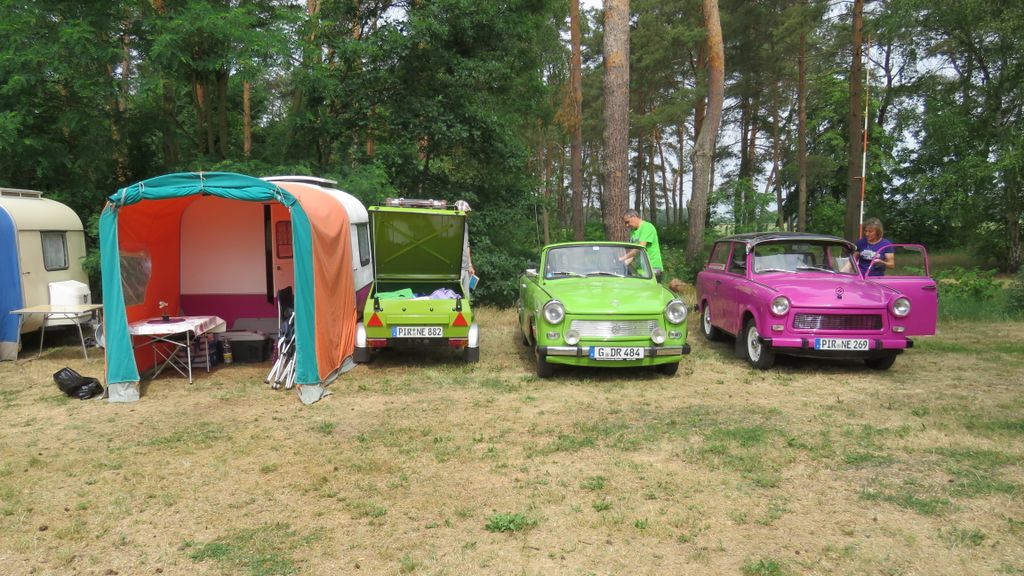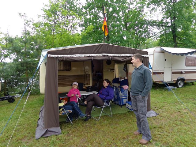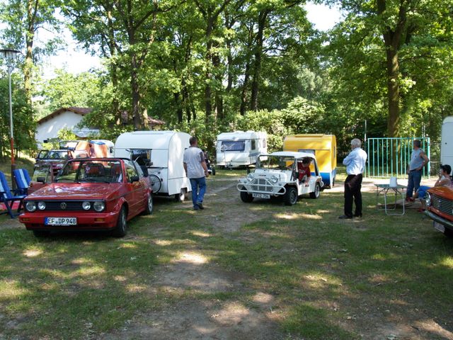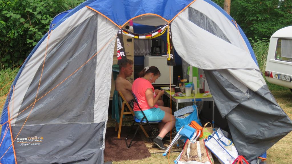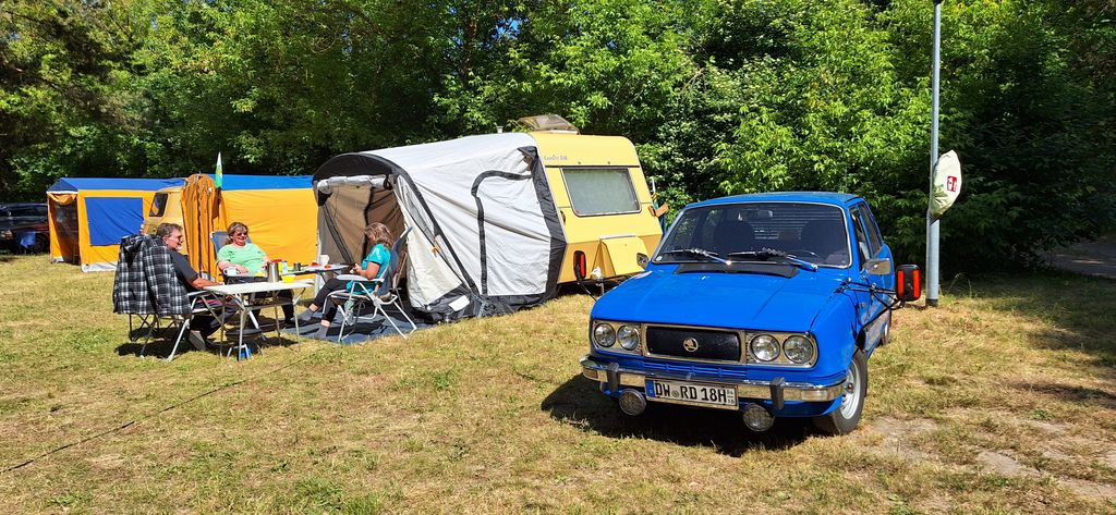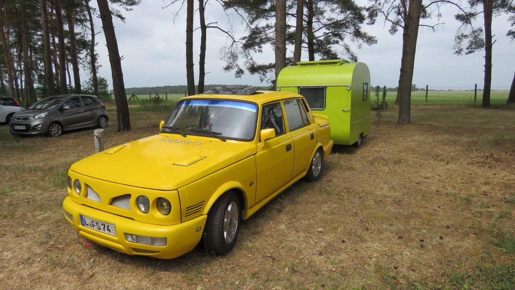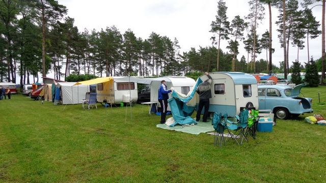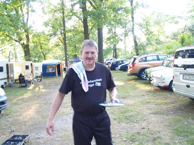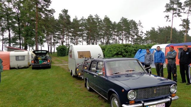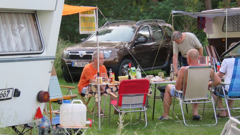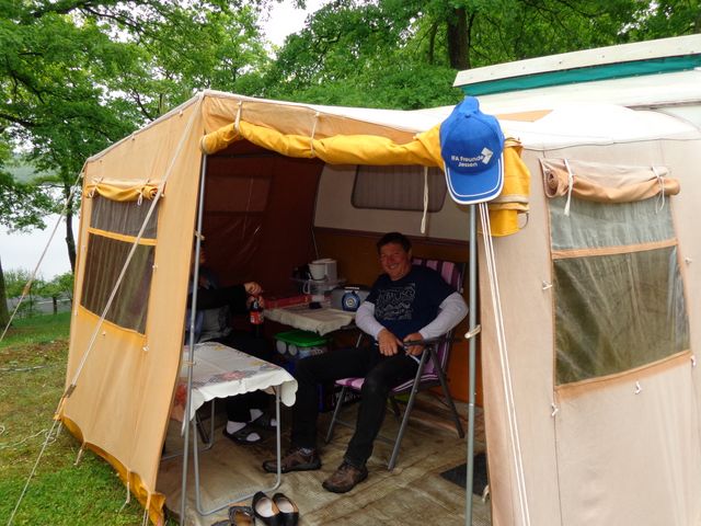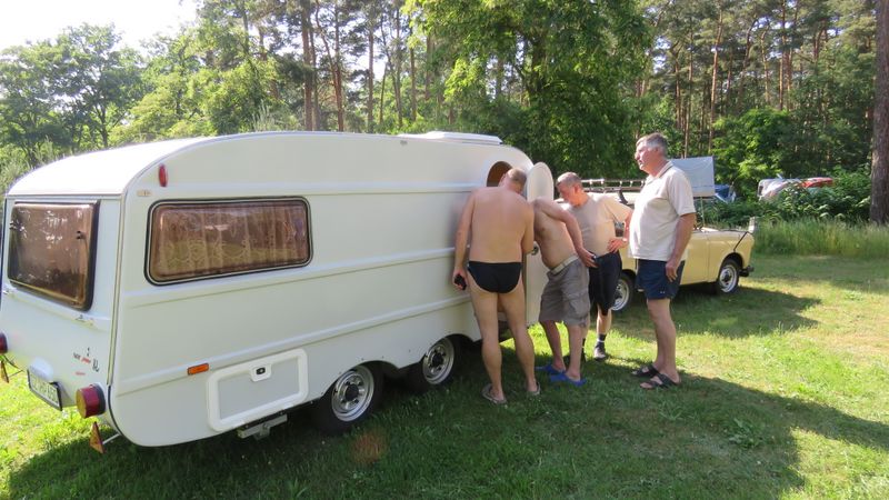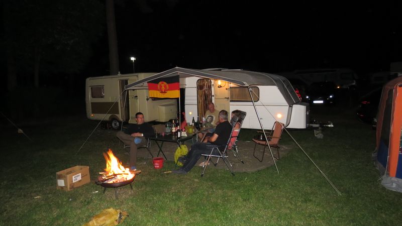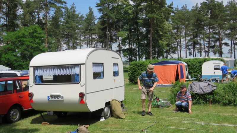Beim gemeinsamen Frühtück haben wir das originellste Gespann prämiert. So konnte Micha mit dem Trabbi-Kübel und dem passenden Qek einen prima Liegestuhl, gesponsert von www.elbe-caravan.de, in Empfang nehmen