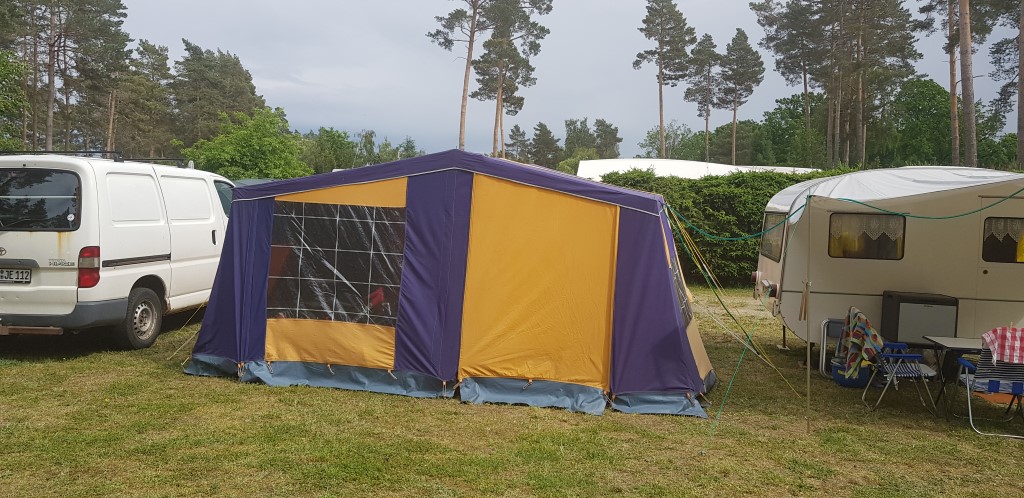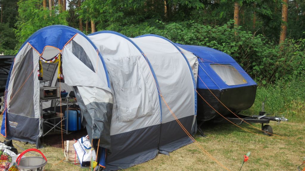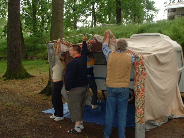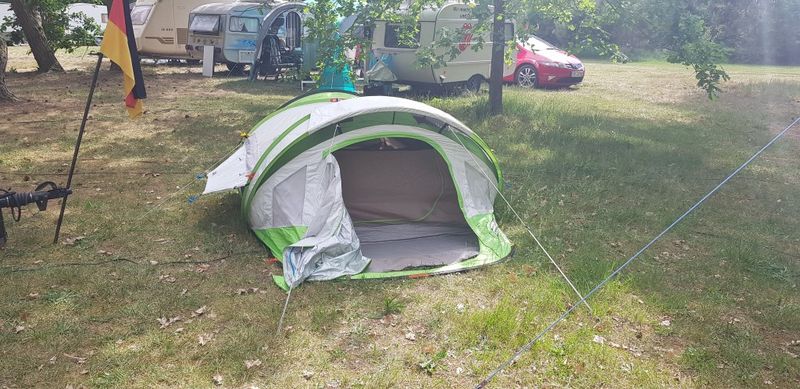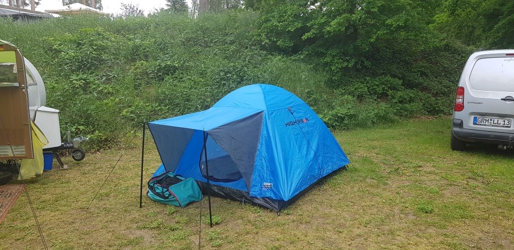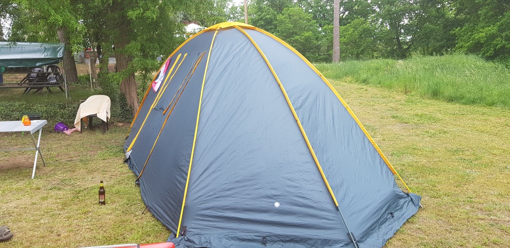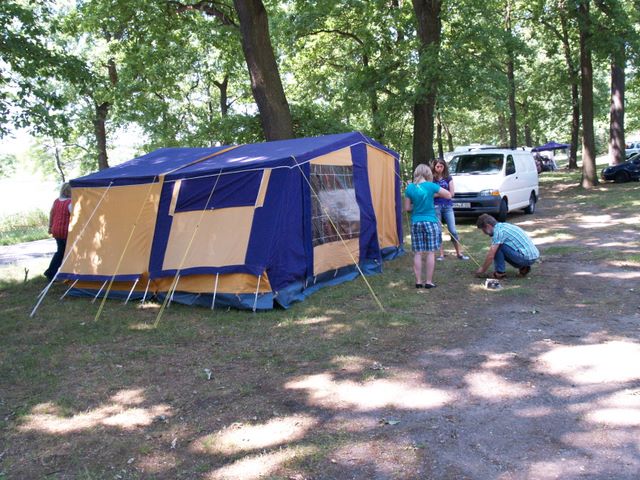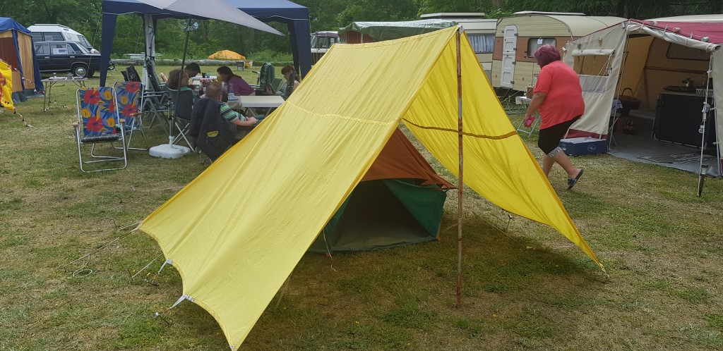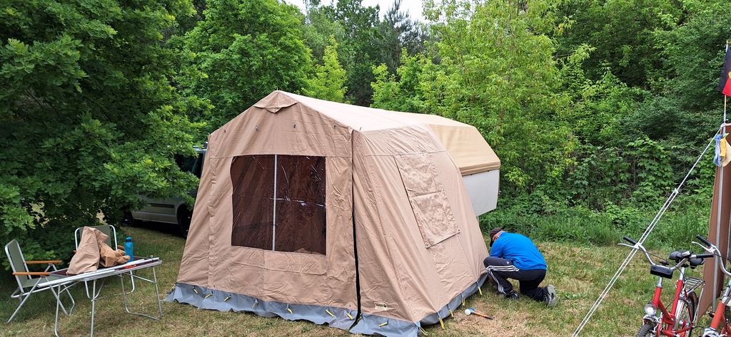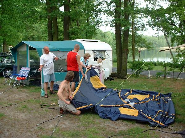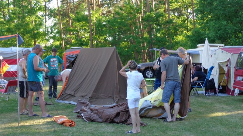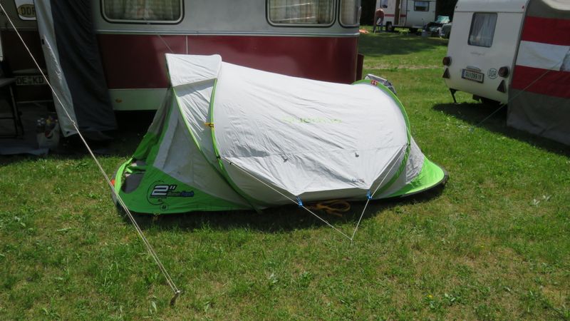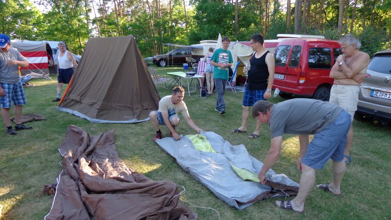 Ein Zelt wechselt den Besitzer. Nach den anfänglich kläglich scheinenden Aufbauversuchern wurde dann doch noch ein Zelt daraus.