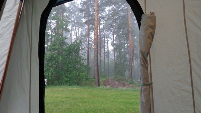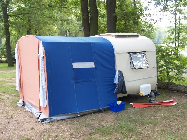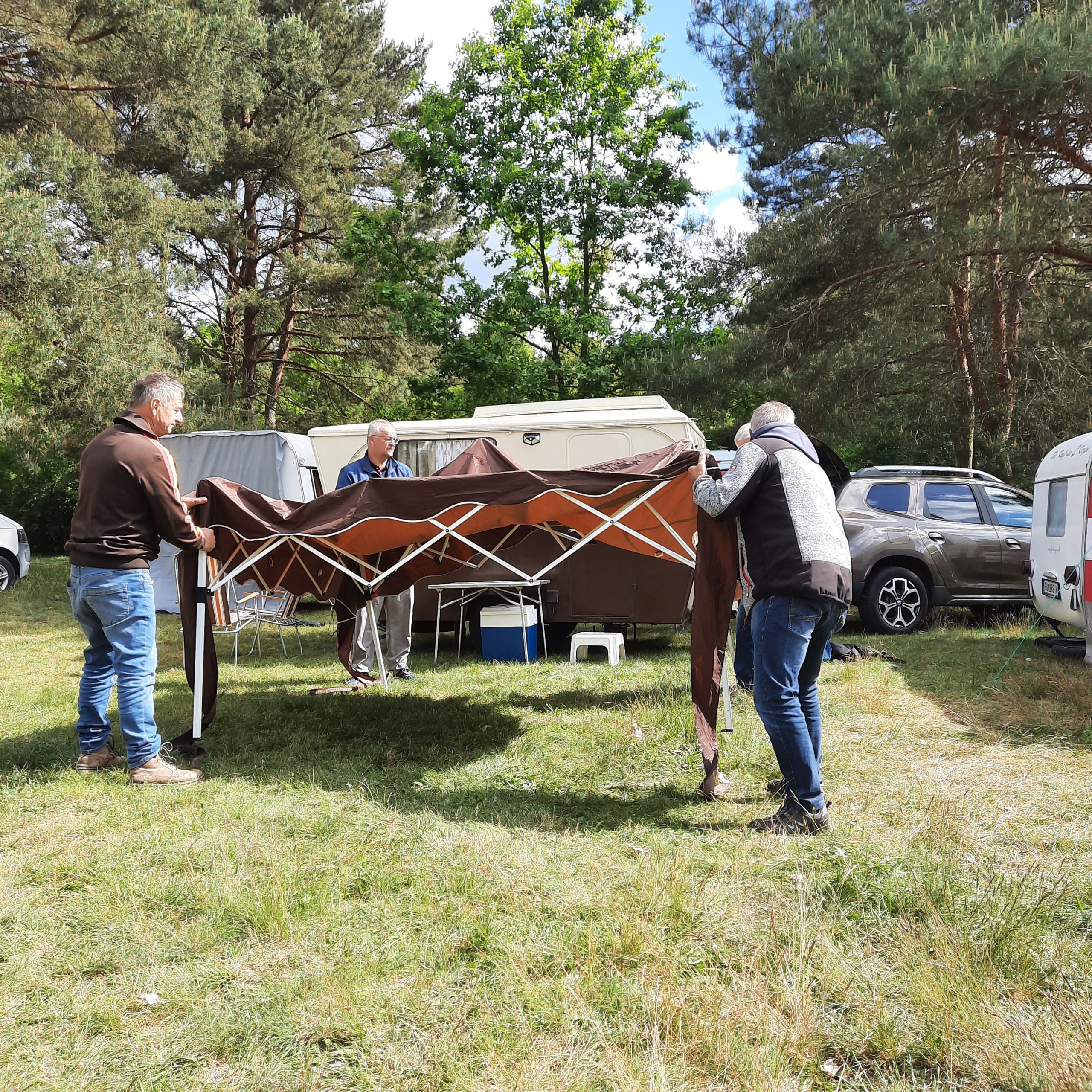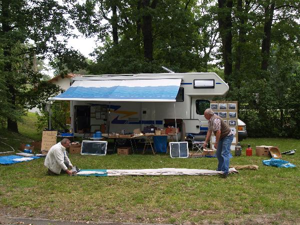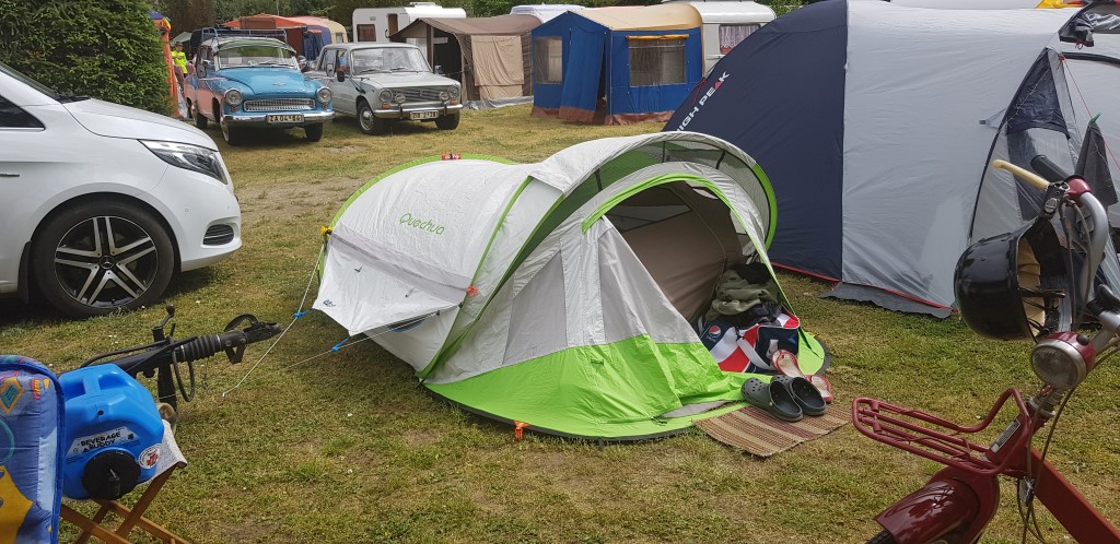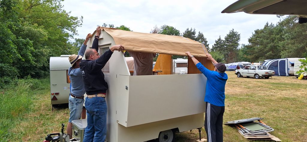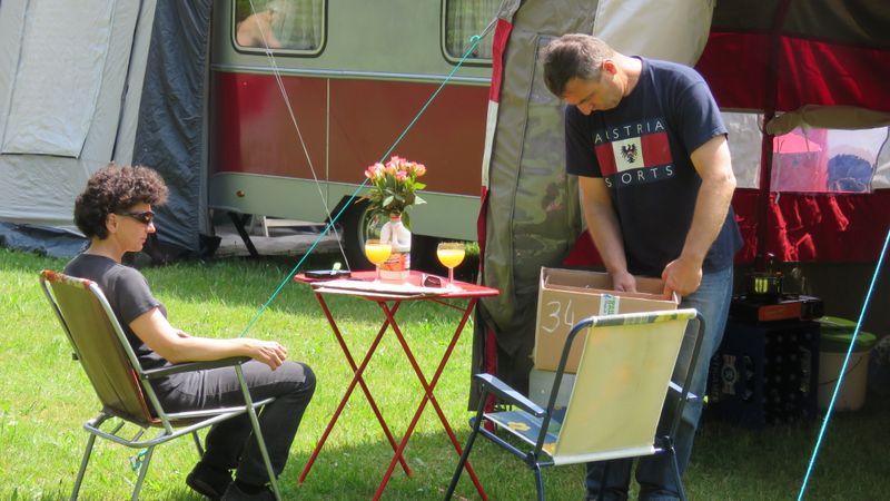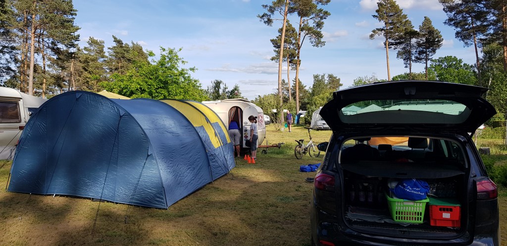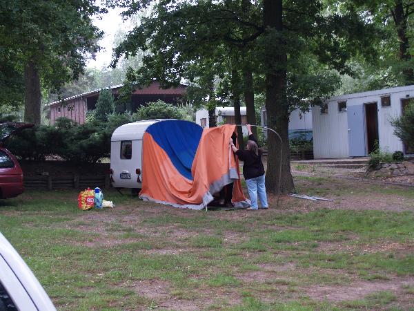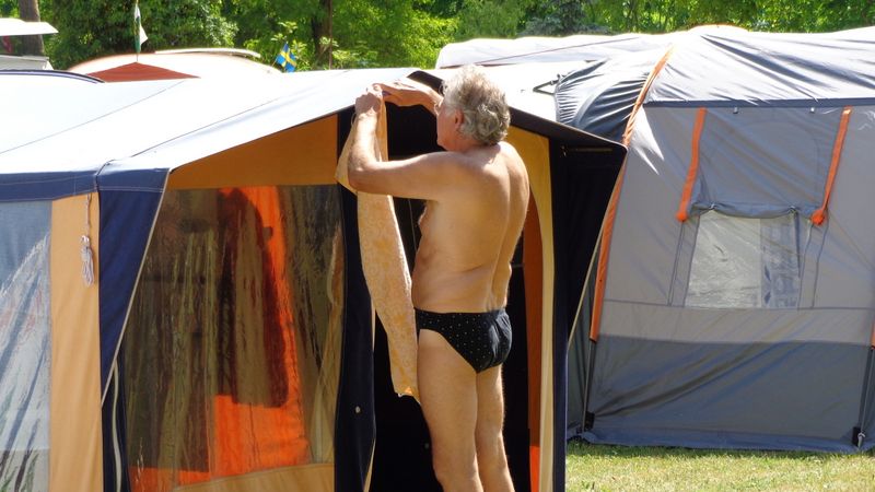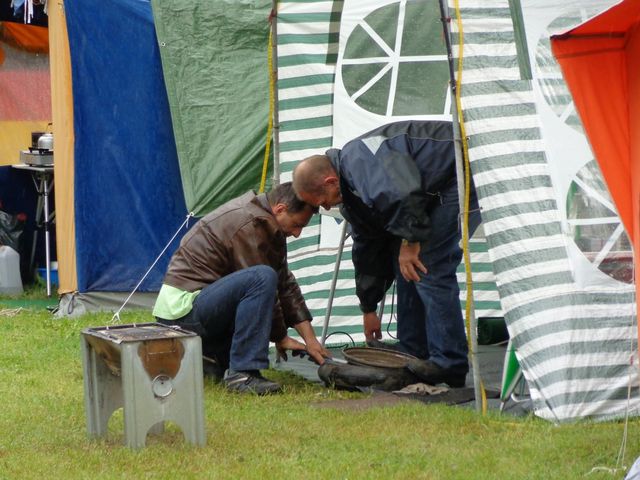 Ein Zelt wechselt den Besitzer. Nach den anfänglich kläglich scheinenden Aufbauversuchern wurde dann doch noch ein Zelt daraus.