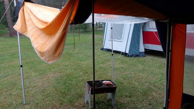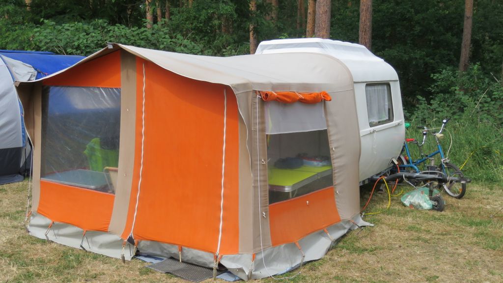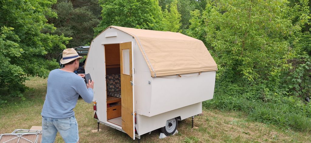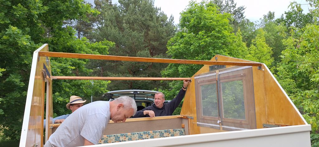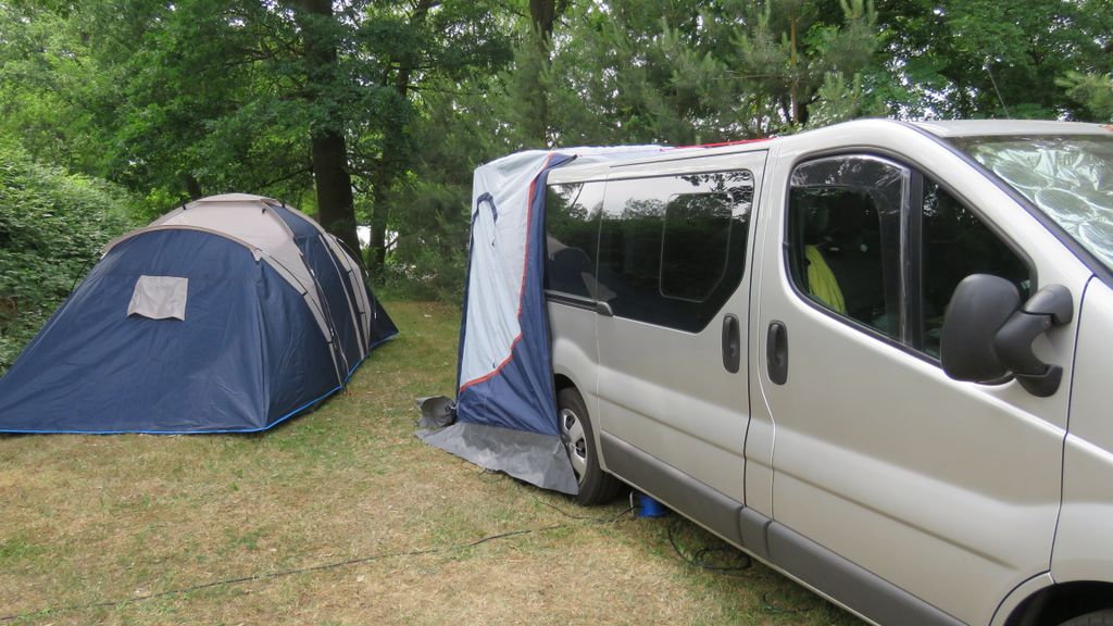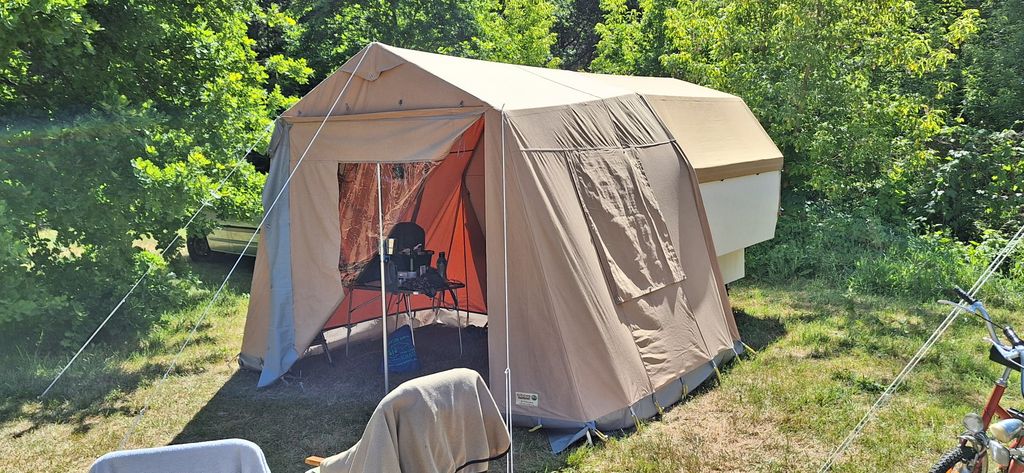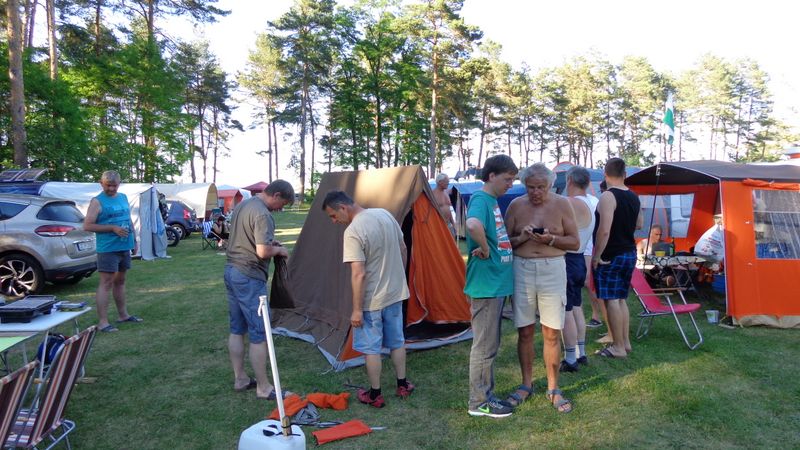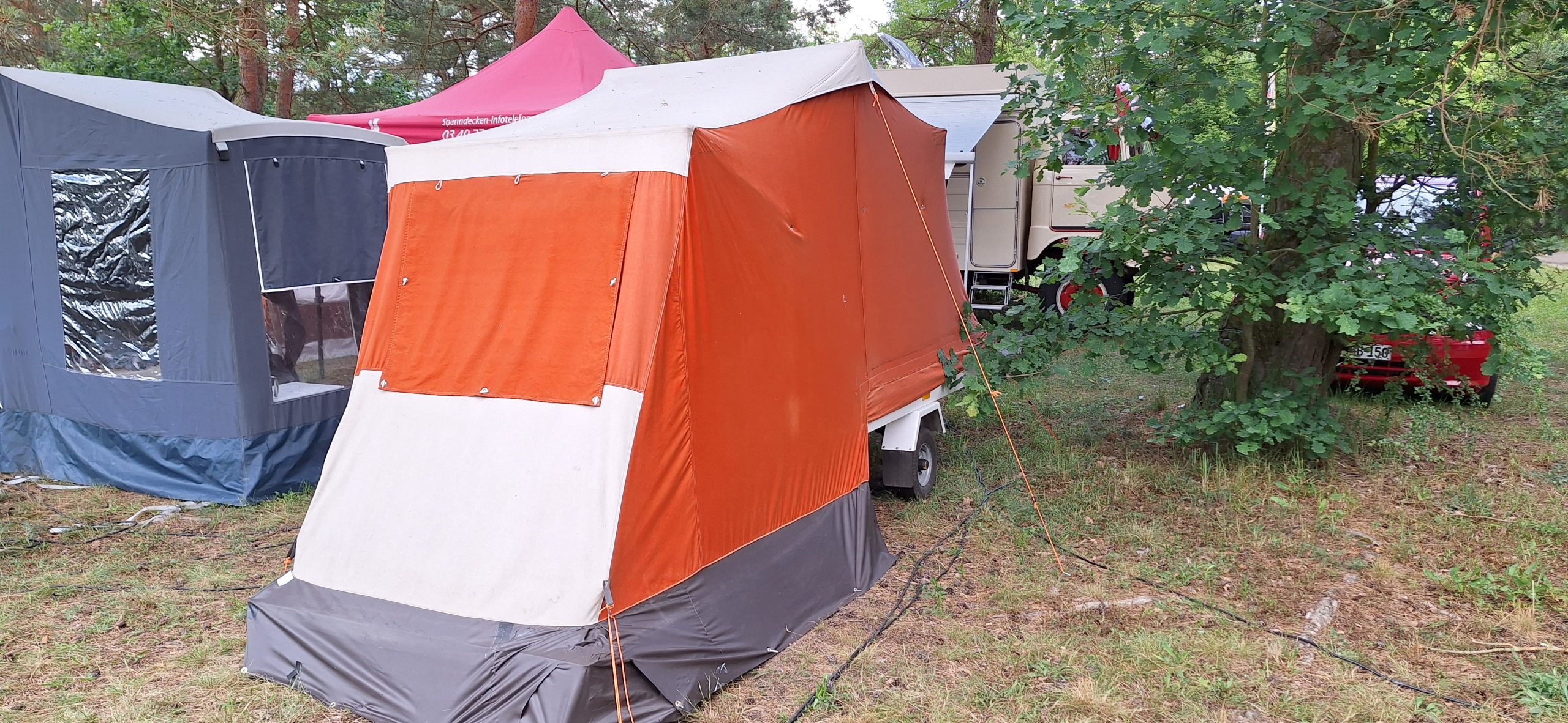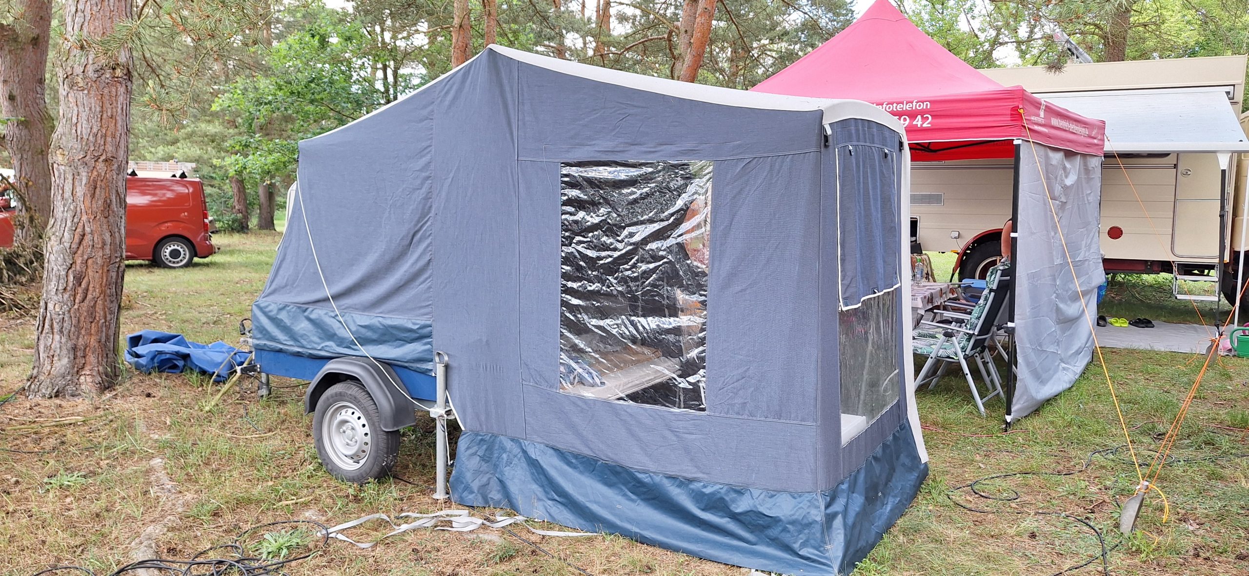Ein Zelt wechselt den Besitzer. Nach den anfänglich kläglich scheinenden Aufbauversuchern wurde dann doch noch ein Zelt daraus.
