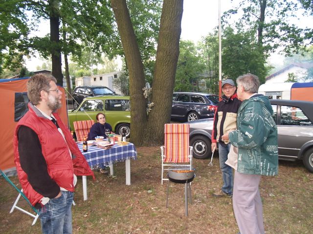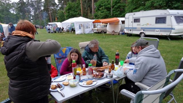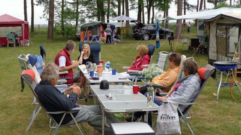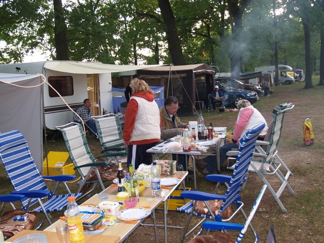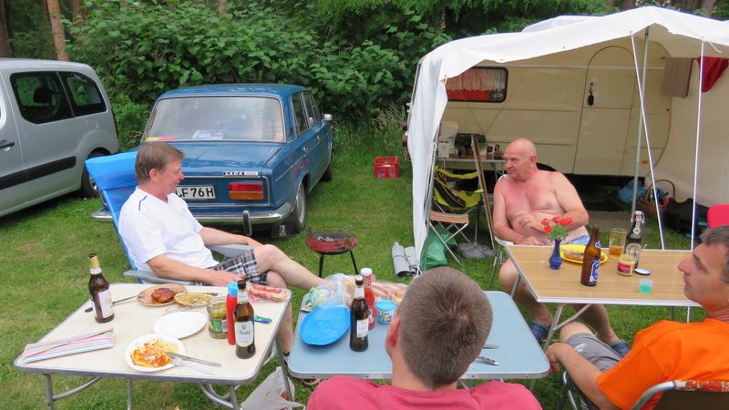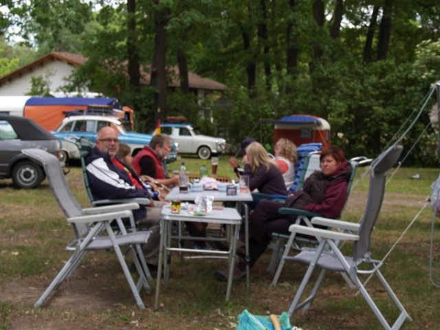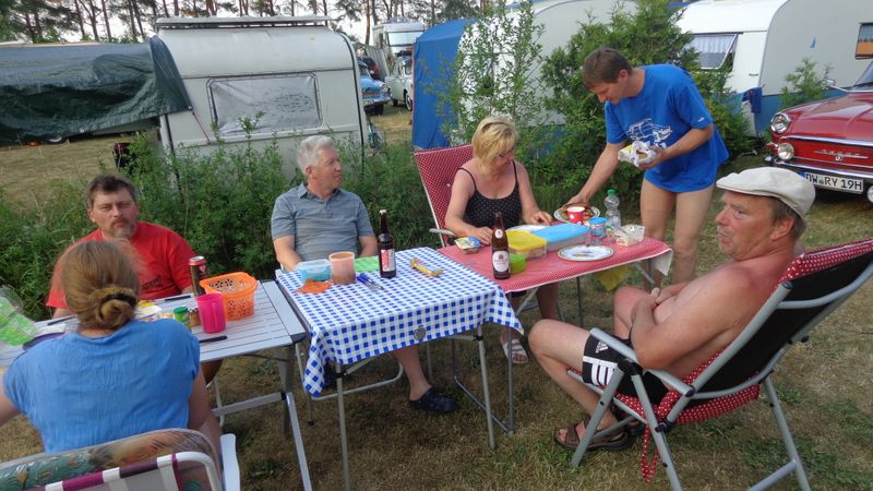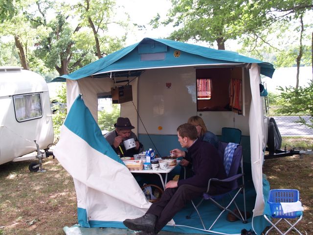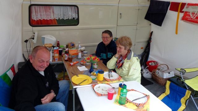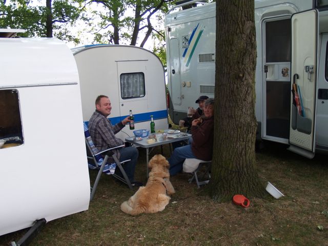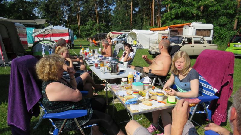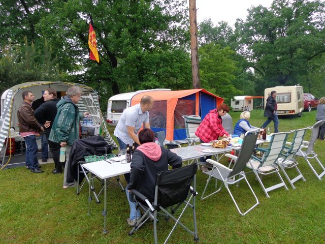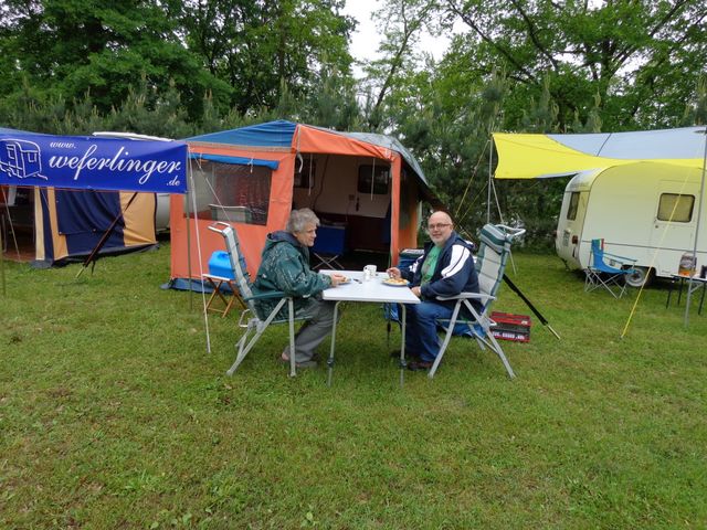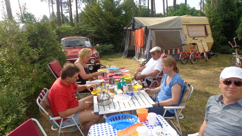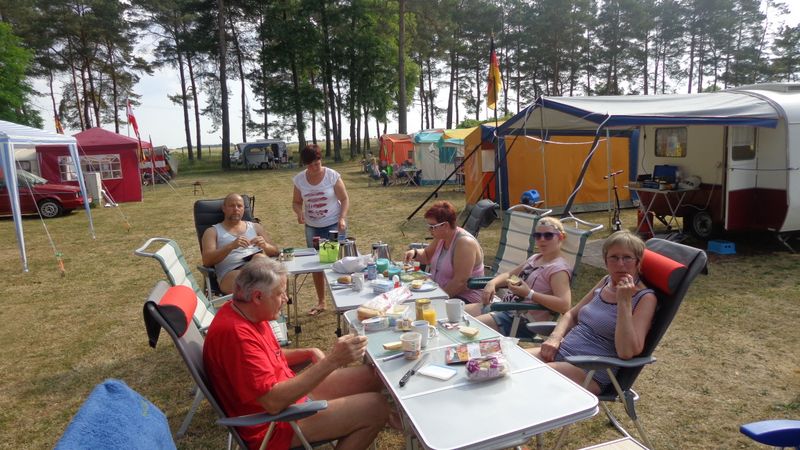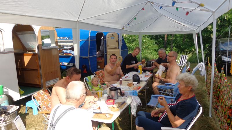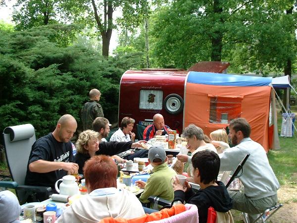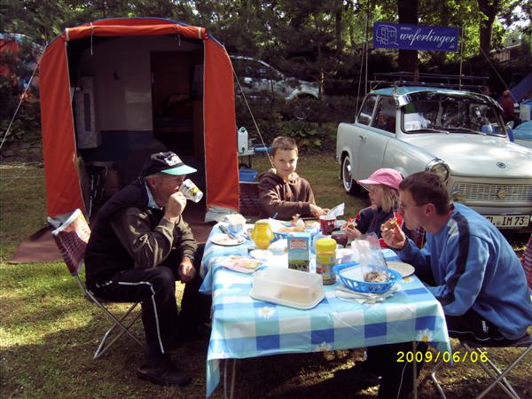 unser gemeinsames Frühstück, schön das alle dabei waren. Da haben wir dann auch gleich das originellste Gespann prämiert. So konnte Micha mit dem Trabbi-Kübel und dem passenden Qek einen prima Liegestuhl, gesponsert von www.elbe-caravan.de, in Empfang nehmen