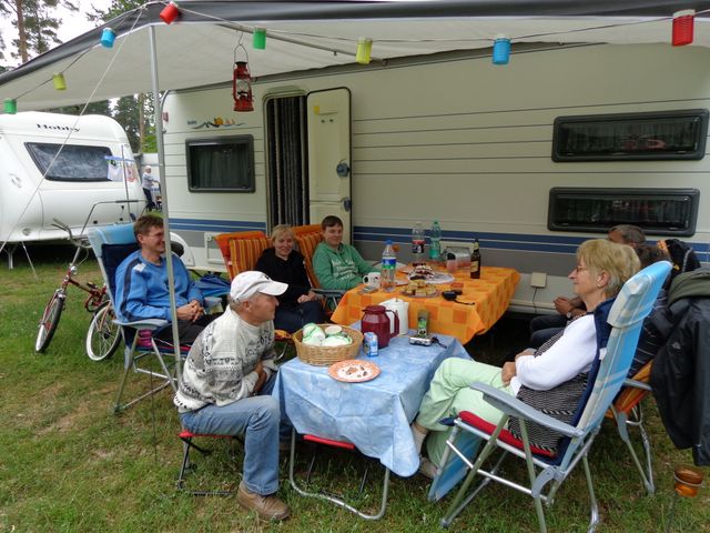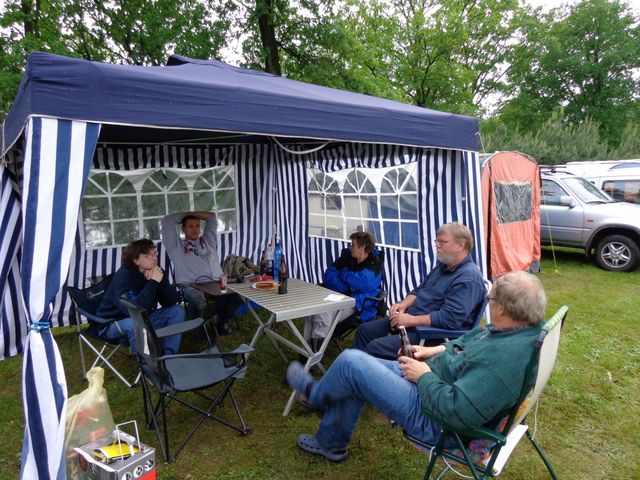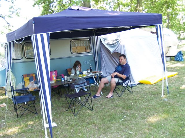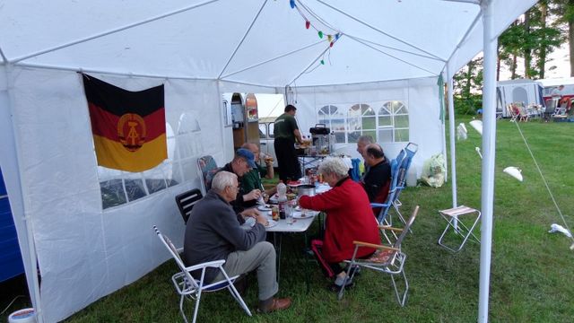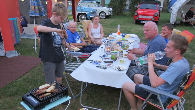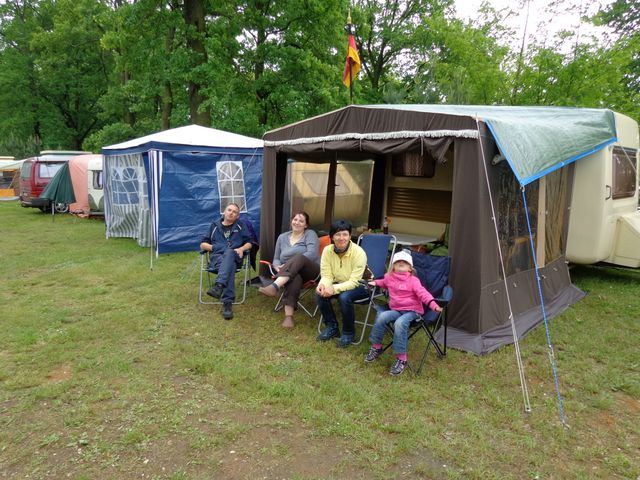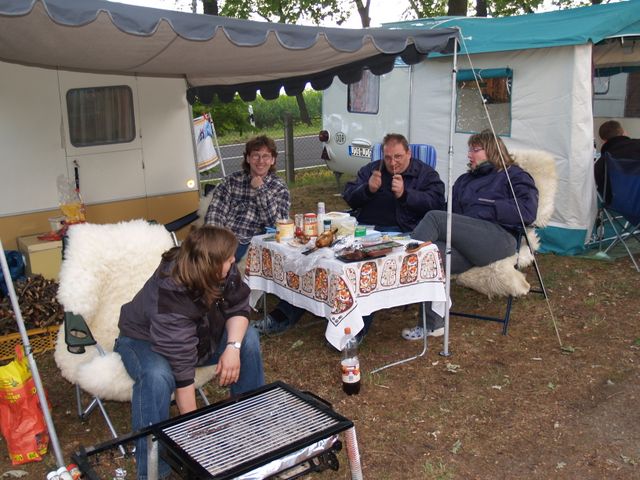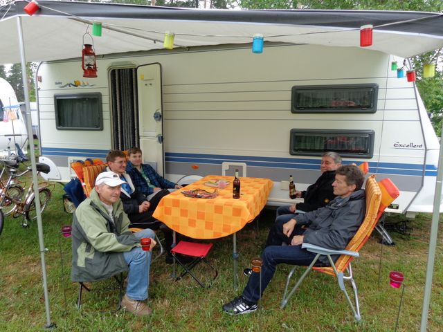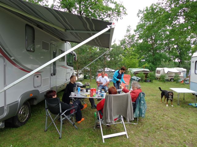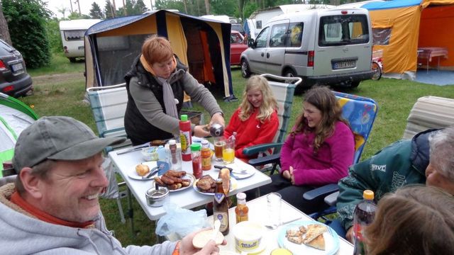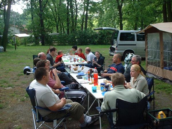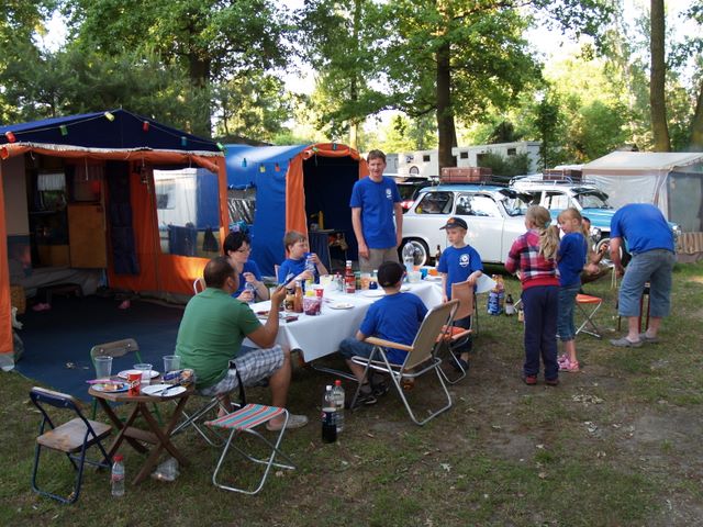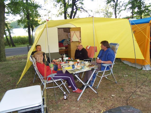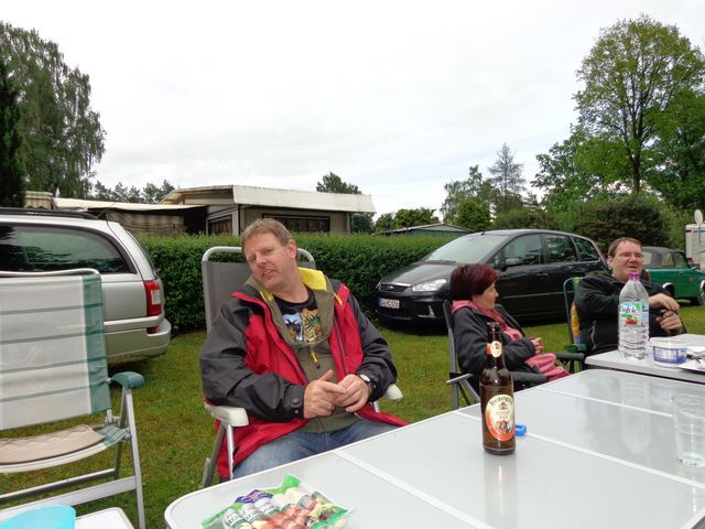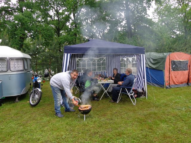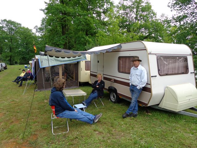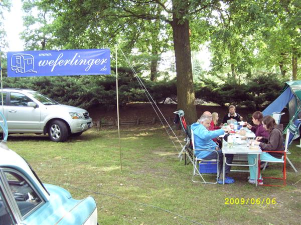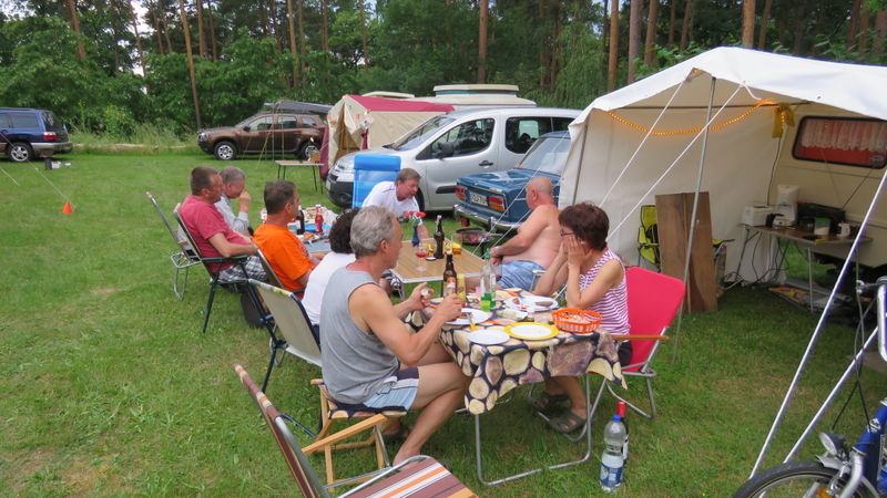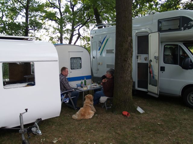 unser gemeinsames Frühstück, schön das alle dabei waren. Da haben wir dann auch gleich das originellste Gespann prämiert. So konnte Micha mit dem Trabbi-Kübel und dem passenden Qek einen prima Liegestuhl, gesponsert von www.elbe-caravan.de, in Empfang nehmen