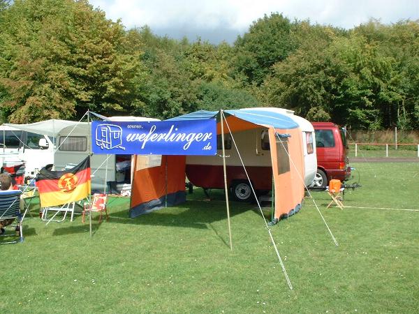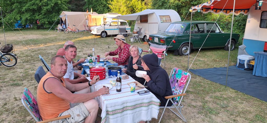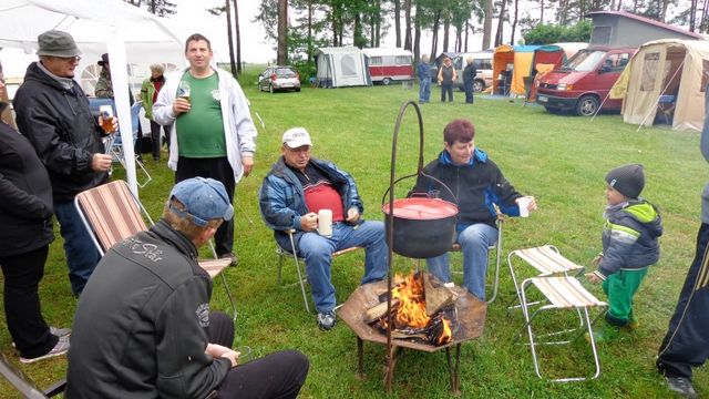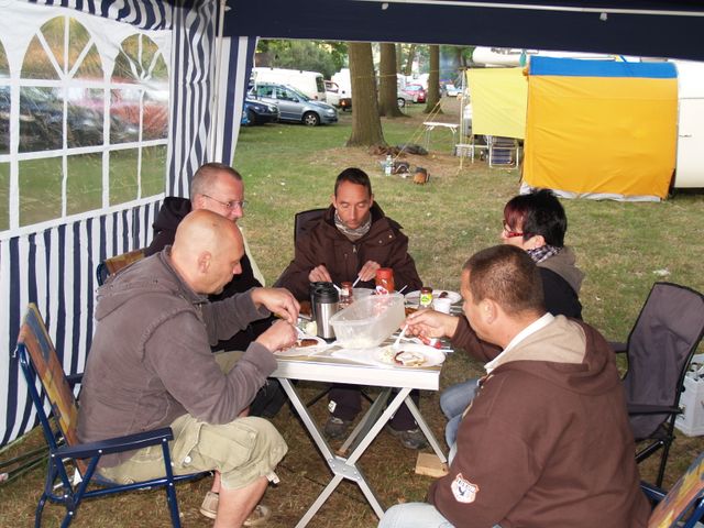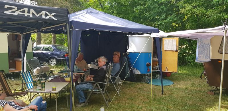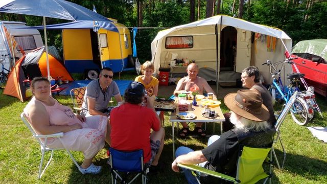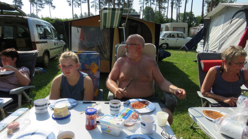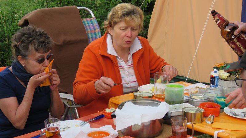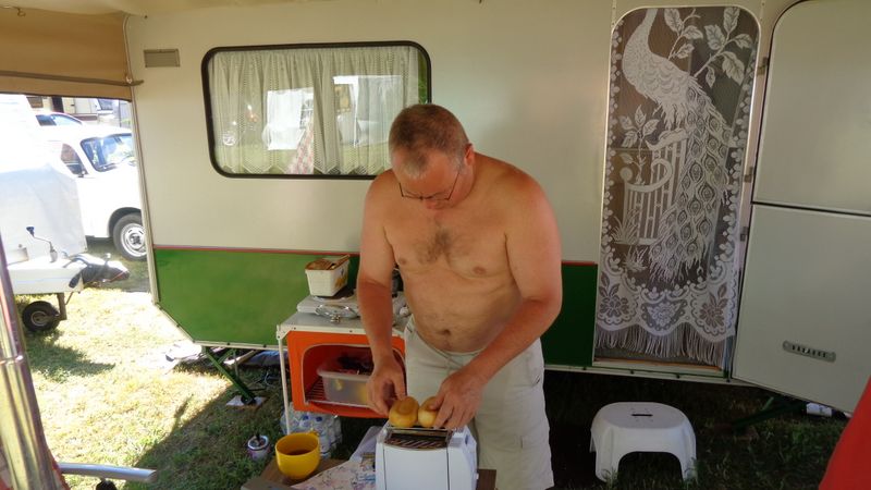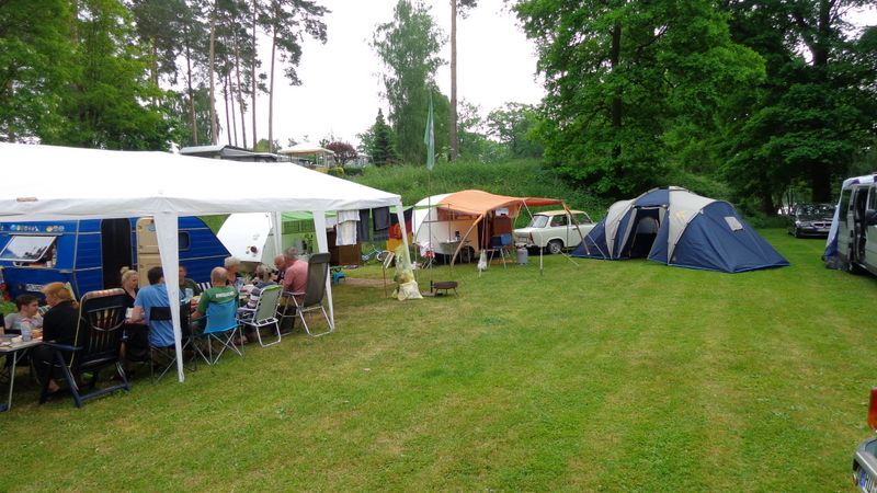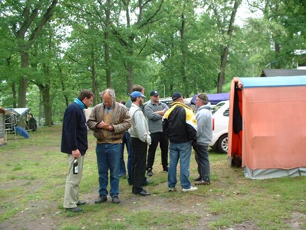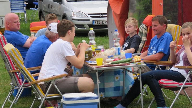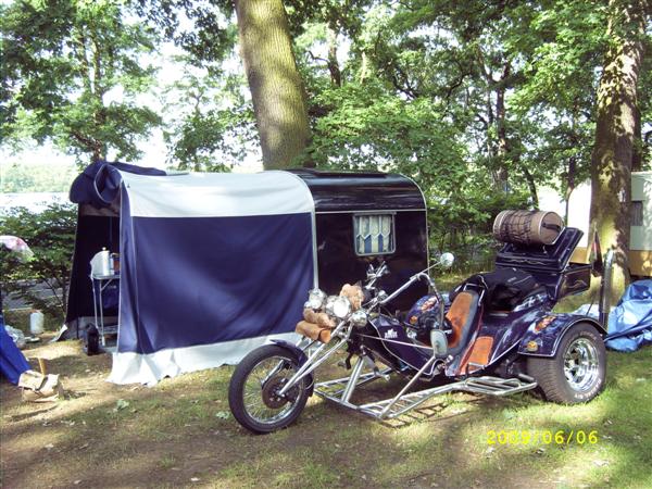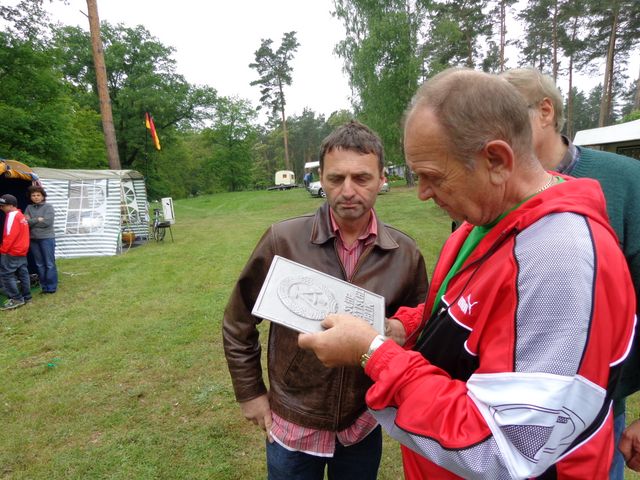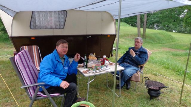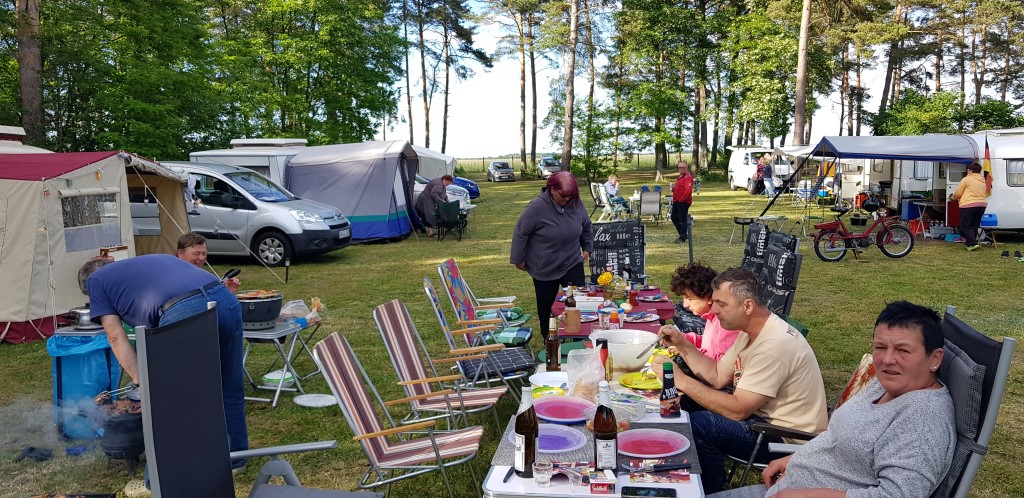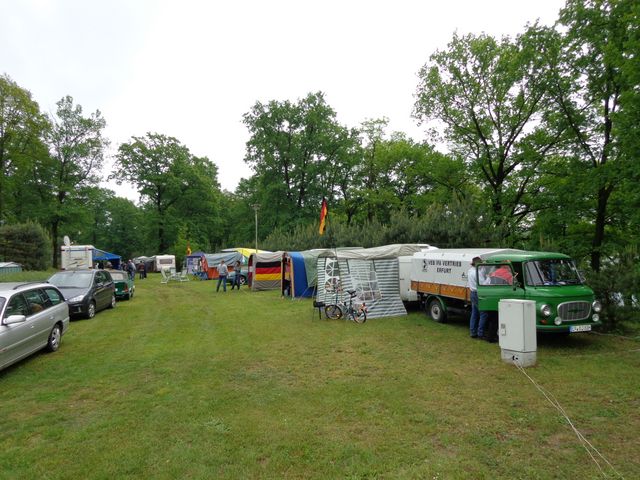 unser gemeinsames Frühstück, schön das alle dabei waren. Da haben wir dann auch gleich das originellste Gespann prämiert. So konnte Micha mit dem Trabbi-Kübel und dem passenden Qek einen prima Liegestuhl, gesponsert von www.elbe-caravan.de, in Empfang nehmen